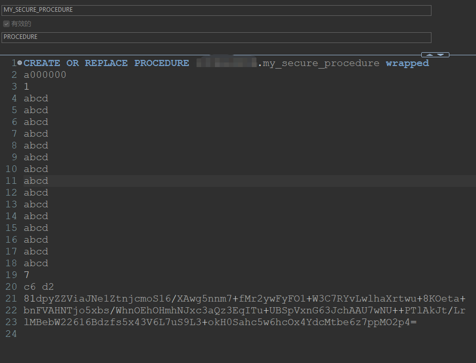 通过 Oracle 管理工具(如 Dbeaver)登录后,可以执行该存储过程,但查看源码时只能看到加密后的代码: